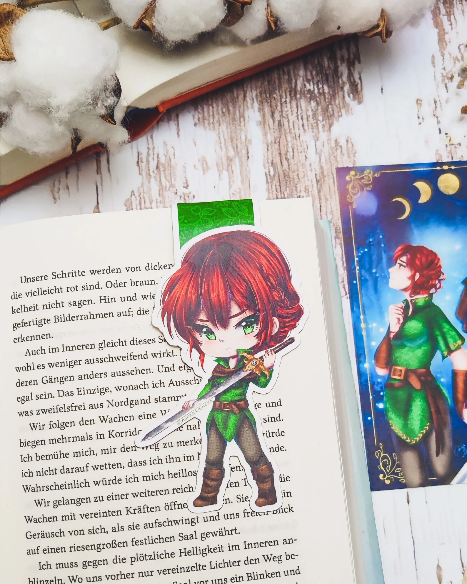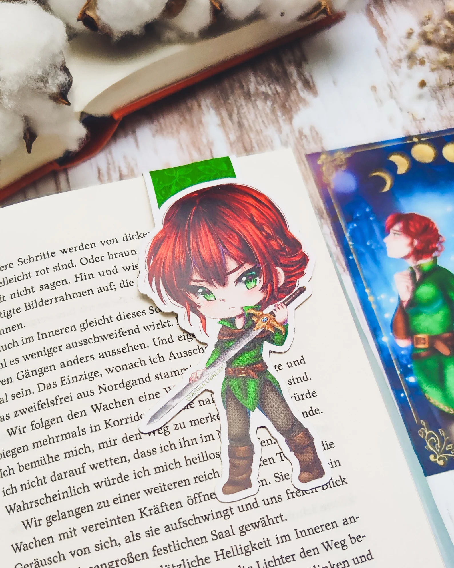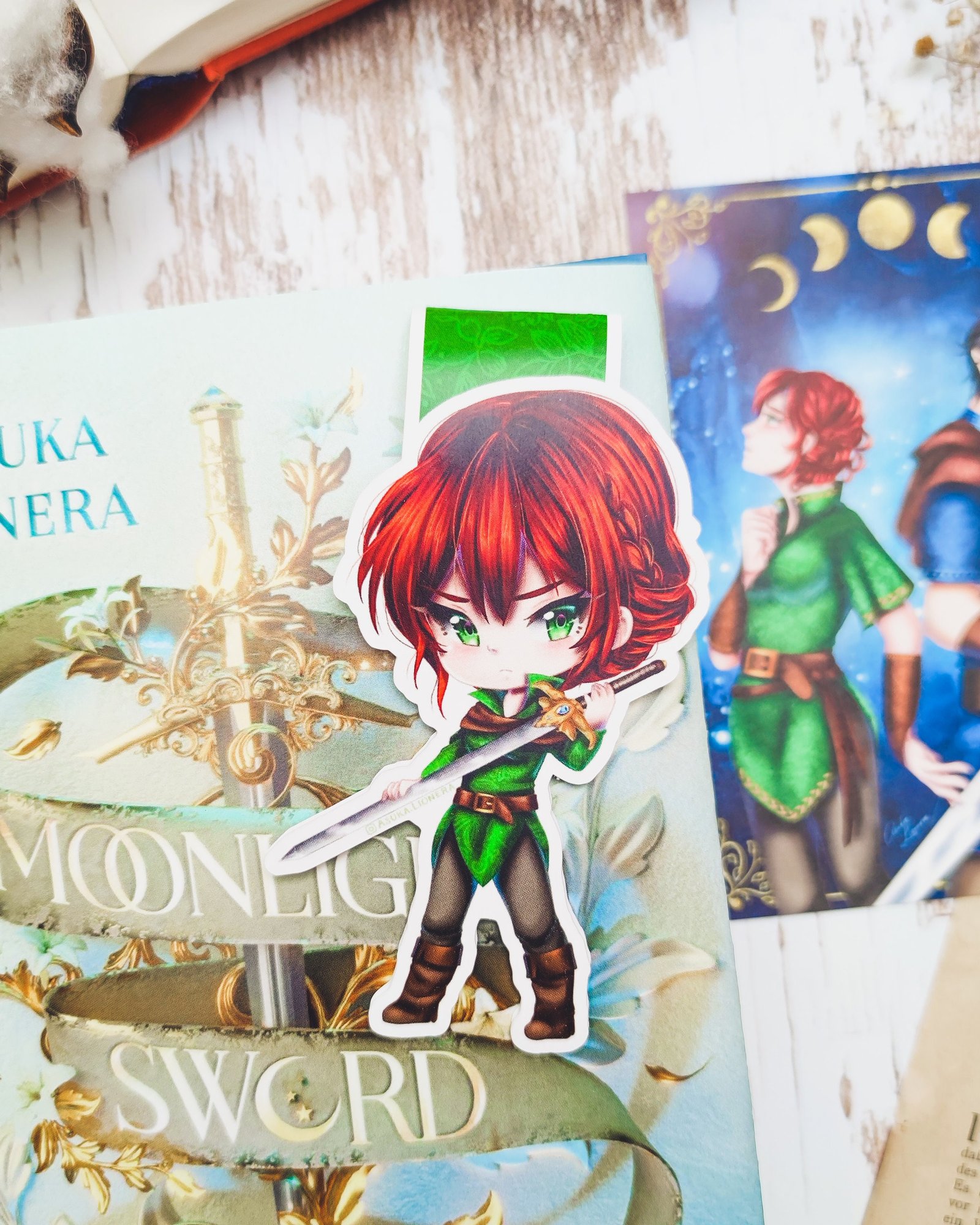 Dieses Magnetlesezeichen ist inspiriert von der Romantasy-Buchreihe „Moonlight Sword“ von Asuka Lionera. Es zeigt Delmira, die weibliche Protagonistin. In ihrer Hand hält sie das magische Schwert Caligram.