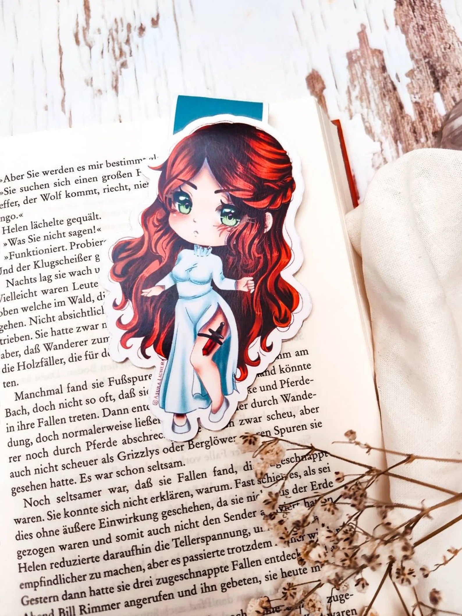 Bist du bereit, den Schleier zu lüften? Mit diesem Magnetlesezeichen holst du dir Penellaphe „Poppy“ Balfour direkt in dein aktuelles Buch. Das handgezeichnete Motiv zeigt Poppy in ihrem klassischen weißen Kleid, mit ihrem charakteristischen roten Haar und – natürlich – dem tödlichen Dolch aus Blutstein an ihrem Bein. Egal, ob du gerade zum ersten Mal in die Welt der Atlantier eintauchst oder die Reihe zum zehnten Mal reest: Poppy sorgt dafür, dass du nie den Anschluss an deine Geschichte verlierst.