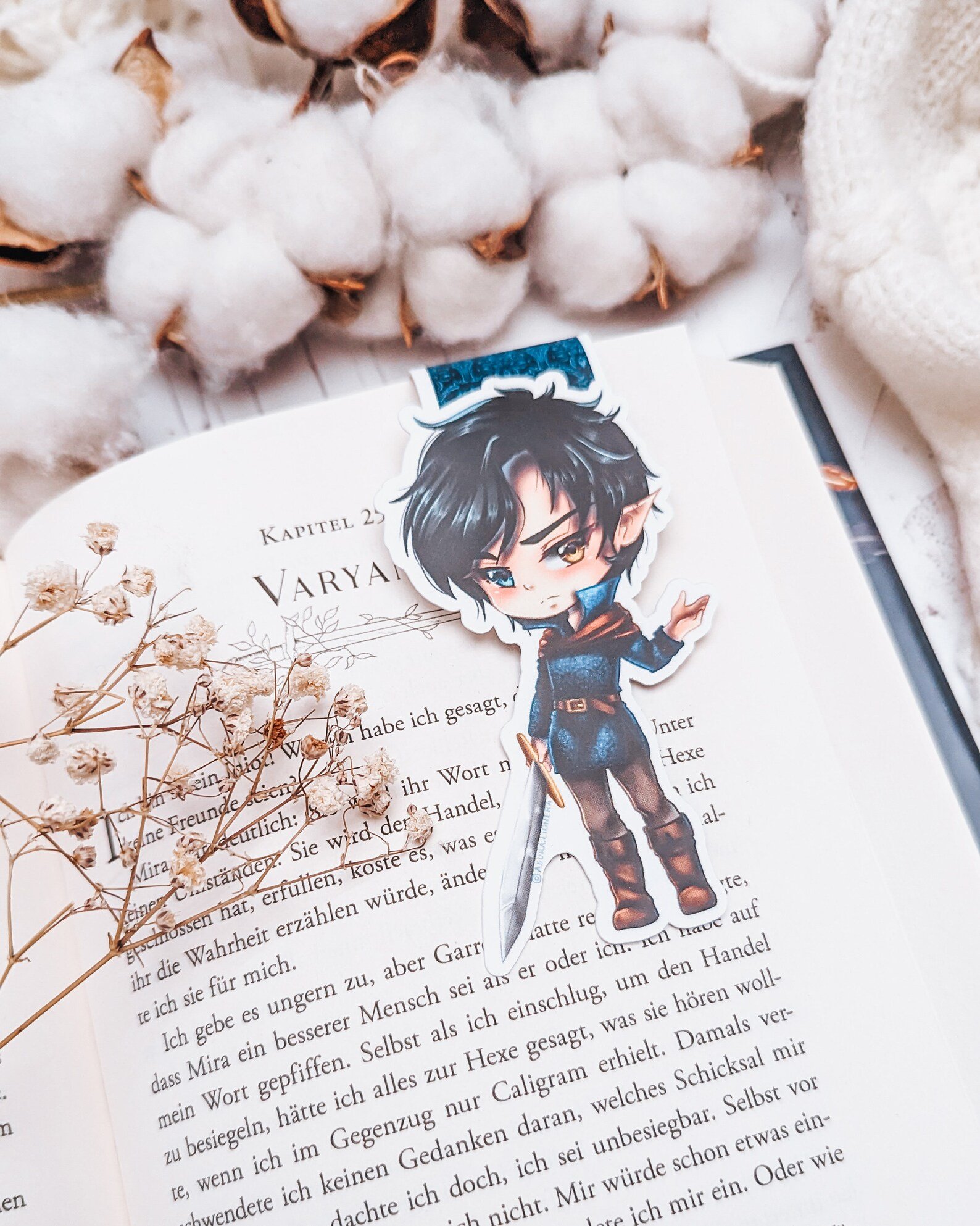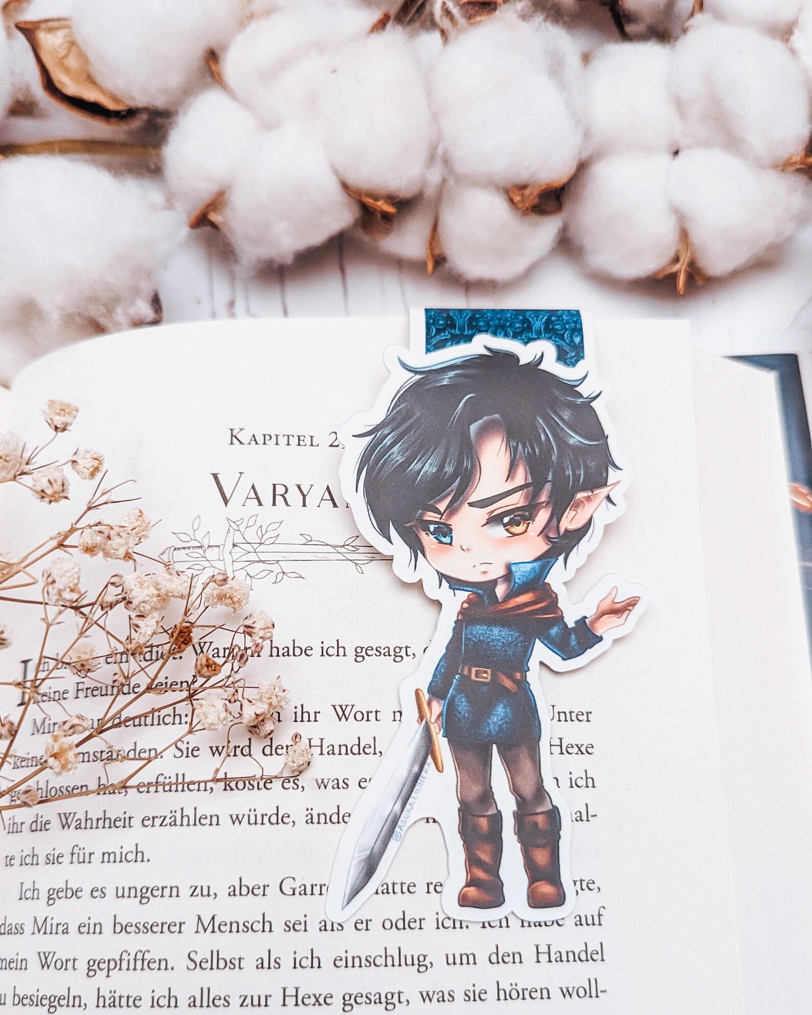 Dieses Bookish Merch ist ein echtes Highlight für deine Sammlung, denn es handelt sich um offiziell lizenziertes Merchandise. Ich habe Varyan höchstpersönlich für dich illustriert, um seine Sehnsucht und Stärke genau so abzubilden, wie ich ihn mir beim Schreiben vorgestellt habe. Jedes Lesezeichen wird mit viel Liebe in Deutschland handgefertigt. Damit unterstützt du direkt die Kunst hinter der Geschichte!