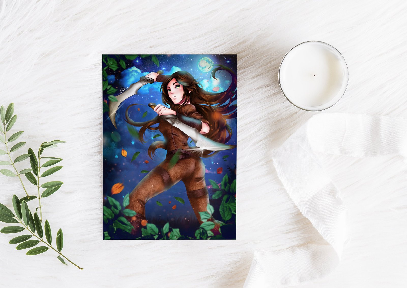 Die Illustration ist beidseitig auf ca. 300g Papier bedruckt und zeigt auf beiden Bildern die Protagonisten Scarlet und Ash.